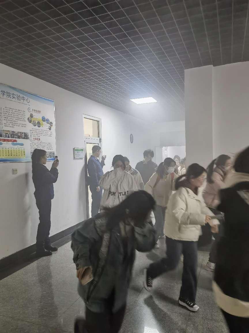 随后,在4号实验楼进行火灾应急疏散演练环节。演练现场,火灾警报拉响后,各楼层安全员在楼梯口、转弯口等引导师生安全有序撤离,师生立即快速、安全进行疏散,严格按照疏散顺序分批依次快速、安全下楼,用最短的时间到达了集合地。结合演练过程中存在的问题,张科长进行分析点评与指导。他指出,此次火灾应急疏散演练老师组织到位、保障有力,同学积极配合、服从命令,按照预定的疏散路线,紧急而有序地撤离到指定地点。希望通过此次演练能够增强师生们的安全意识,提高广大师生的逃生自救和互救能力以及抵御、应对紧急突发事件的能力。