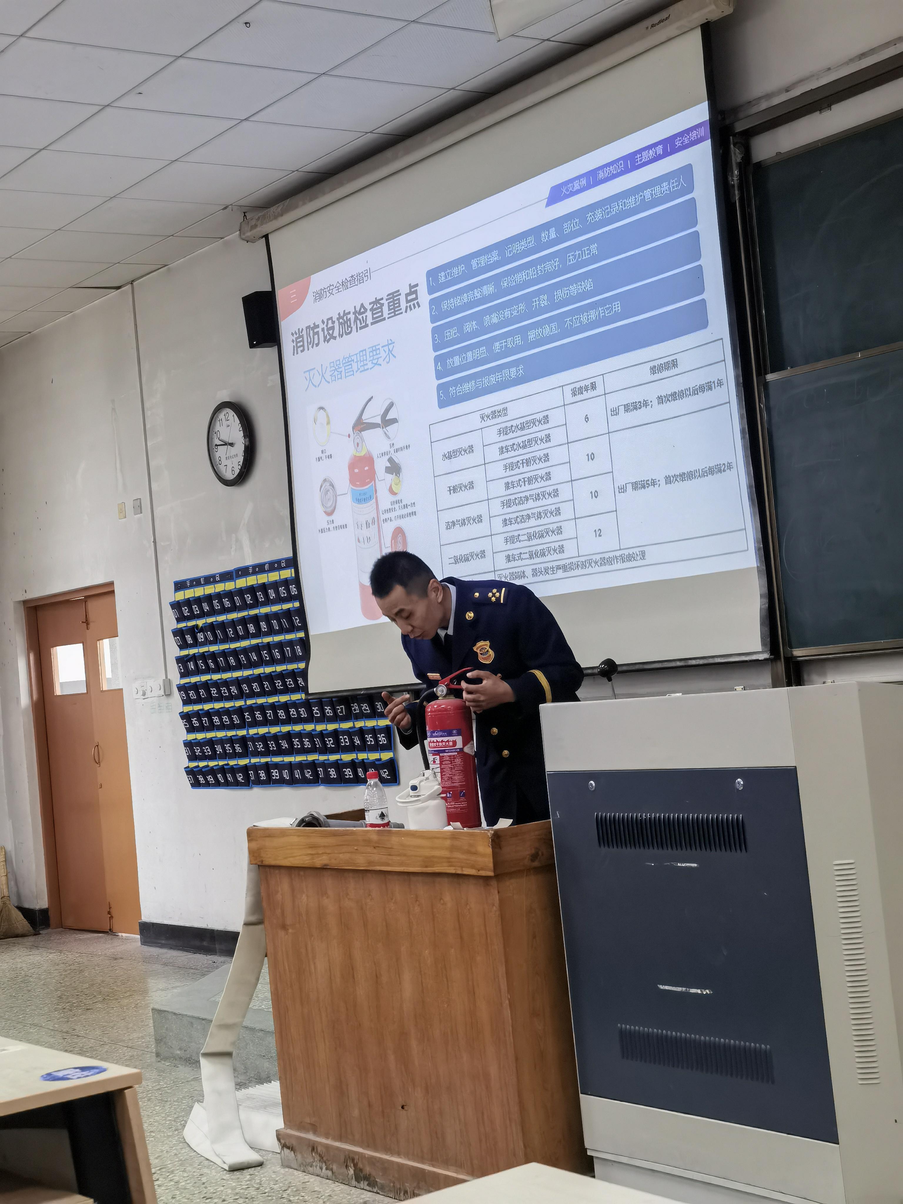活动主要分为三个环节:首先是消防安全教育培训。培训伊始,王介忠书记强调,广大师生要高度重视消防安全,珍惜此次消防安全演练活动,提高消防安全意识,在思想和行动上充分认识消防安全的重要性和必要性。随后,张健利用专业消防知识及技能,结合真实案例,向大家讲述火灾特点、火灾发生的严重后果及疏散和逃生知识,为参加讲座的师生敲响了消防安全的警钟。同时,张健还对灭火器械、防烟面具的正确使用方法和注意事项进行了详细讲解。